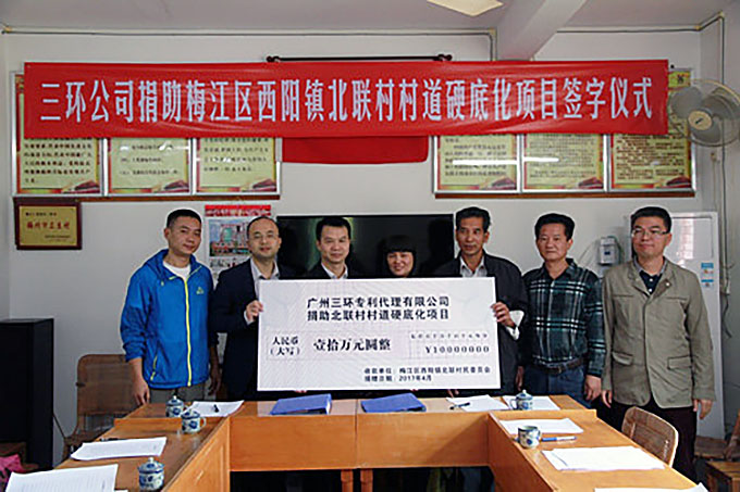 2017年4月,三環(huán)總經(jīng)理郝傳鑫赴梅州市梅江區(qū)北聯(lián)村,在廣州市知識(shí)產(chǎn)權(quán)局局長鄧佑滿的見證下,與北聯(lián)村簽訂了“北聯(lián)村村道硬底化項(xiàng)目捐建協(xié)議”,捐助10萬元,專項(xiàng)用于村道建設(shè)。該項(xiàng)目的實(shí)施,將實(shí)現(xiàn)全村所有自然村通水泥路,為村民出行和運(yùn)輸水果提供了出行方便,為北聯(lián)村實(shí)現(xiàn)脫貧打下了良好基礎(chǔ)。